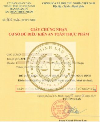 – Thời hạn của Giấy vệ sinh an toàn vệ sinh thực phẩm là 3 năm, sau khi hết hạn doanh nghiệp/hộ kinh doanh phải thực hiện đăng kí lại Giấy phép.