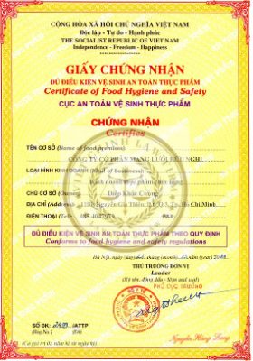 – Giấy phép an toàn vệ sinh thực phẩm cho sản phẩm yến sào, linh chi, nhân sâm, đông trùng hạ thảo.