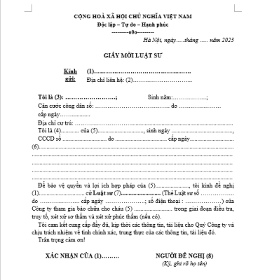MẪU ĐƠN MỜI LUẬT SƯ THAM GIA BÀO CHỮA