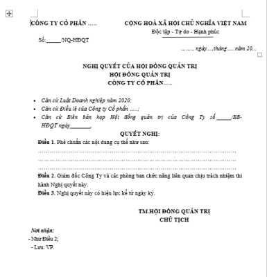 1. Mẫu Quyết định, Nghị quyết của Hội đồng quản trị